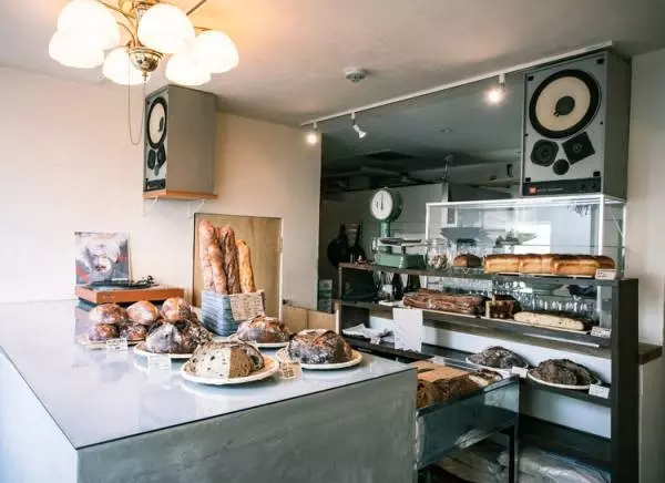 カンパーニュやバゲット、フォカッチャに食パンなどが並ぶ。パンが陳列された台は、立ち飲みスペースにも