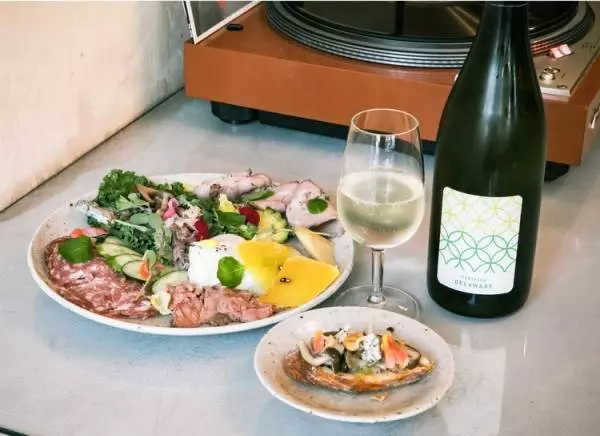店内で、ブルスケッタやサンドイッチにして提供している具材を一皿に。ご家庭でパンを気軽に楽しむなら、という西野さんのアイデア。お薦めワインは「清澄白河フジマル醸造所テーブルトップ デラウェア 2019」2,000円(販売価格)