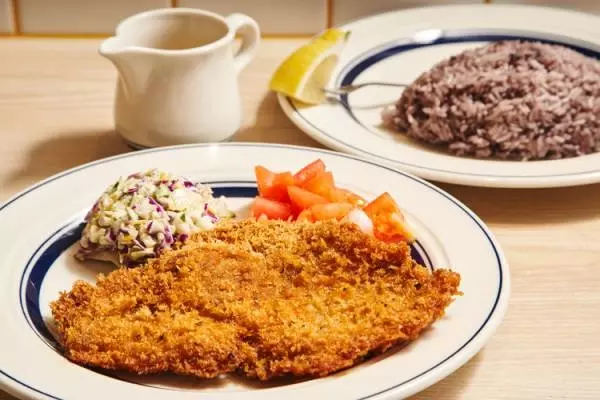 『貴族カツレツ定食』1,210円(税込)。ライスが紫なのは「意味はありません。楽しそうかなって(笑)」。糖質を抑えたカリフラワーライスに変更も可だ