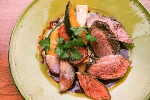 『牛ザブトンステーキ』はミディアムくらいまでじっくり火入れをし、時間をかけて休ませながら丁寧に仕上げていきます。肉の旨みが凝縮した弾力のあるステーキを引き立てるのは、西洋ワサビと赤ワインのソース。主役はお肉ながら、根菜など季節の野菜もしっかりローストしており、ホクホクの食感と濃い野菜の味が広がります。