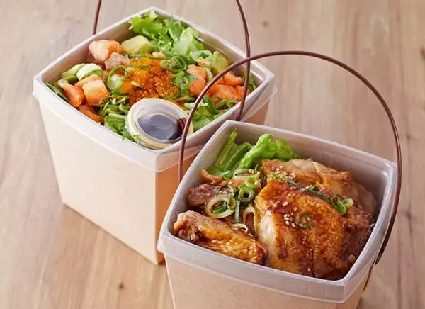 写真手前:『HARUchan CHICKNチキンステーキ丼」693円(税込)、写真奥『サーモン アボカド丼』748円(税込)