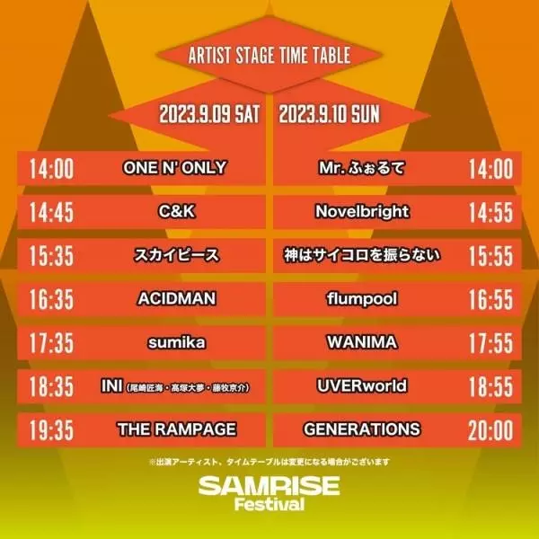 2日目はロックバンド「WANIMA」が疾走感たっぷりに客席を沸かせ、「UVERworld」は観客を大いに巻き込み会場が一体となった圧巻のパフォーマンス!トリはダンス&ボーカルグループ「GENERATIONS」がパワフルなステージで締め括ります。