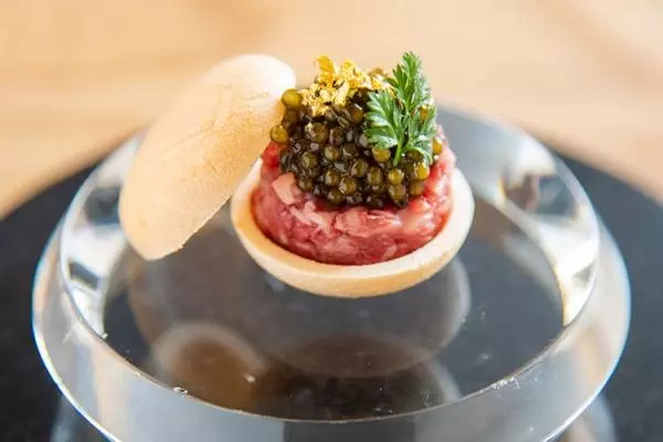 まずスタートはグラスの器で登場する『馬肉のタルタルキャビア』。馬肉をたたいたタルタルに、キャビアがふんだんにのっていた実に贅沢な一品です。