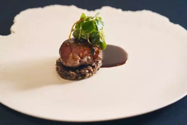 『小鳩 有機黒豆』。さっぱりとした仔鳩を日本の黒豆と共に。25,300円のコースのメイン