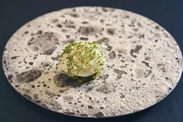 こちらは、夏のスペシャリテ。ズッキーニ、枝豆、モロヘイヤ、胡瓜、つるむらさきなどの夏野菜を生のまま、あるいは茹でたり、ソテーしたりとそれぞれにあった下拵えを施してからたっぷりのバジルを使ったピストゥのソースを絡め、すだちの酸も効かせて爽やかな味わいに仕立てています。その上に夏牡蠣のムースをのせ、昆布だしのゼリーでカバー。海の岩場を連想させるようなお皿を使うなど、料理とアートの一体感も今橋シェフならではのスタイルです。