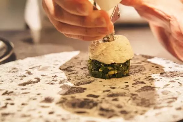 メイン料理となる小鳩のグリルは、仔鳩を木片や藁で軽く香りをつけながら炭火焼きにして、鳩の肝のソースで深みのある旨みをプラスしています。小鳩の下に敷いたのは骨のだしや炭のオイルスパイスなどを使って炊いた黒豆。フランスではレンズ豆で合わせるところを日本の食材を使うことで親しみやすい一皿に仕立てられているのです。
