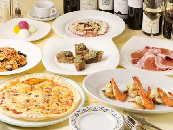 イタリアン・フレンチをベースに和の食材も取り入れています。パーティーコースも充実しており、エビスビール、ワインなども含まれる飲み放題は1500円で追加できます。スタンダードなシェアスタイルの『ゴールドコース』は、前菜2種、サラダ、ピッツァ、魚メイン、肉メイン、パスタ、デザートのコースです。