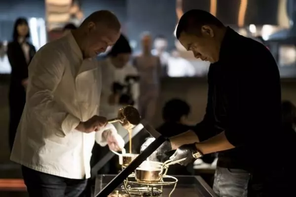 シェフたちがかけてくれたソースはミモザを煮出した金粉入りのもの。それを黒い皿にぬると輪島塗、漆塗りの芸術作品じゃないですか。