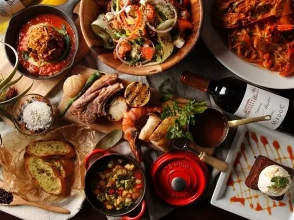 その食材に最もふさわしい調理法やスパイスを用いる、モダンインターナショナルキュイジーヌを提案。「飲み放題&サラダやお肉料理等」(全8品)は、飲み放題2時間と旬食材の前菜やメインディッシュ等全8品がついたプラン。友人や仲間との気軽なパーティー集まりに便利です。