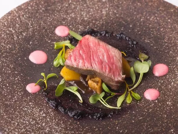 ワインを作るときに出る葡萄の果皮や種(マール)などを食べ、足利の豊かな自然の中でのびのびと育った「足利マール牛」のロースト。