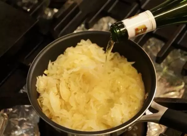 鍋にバターを入れ火にかけたら、スライスした玉ねぎと塩をひとつまみ入れ、しんなりするまで炒める。玉ねぎが透き通ったら、ザワークラウトを加えてバターを絡めるように炒める。② 白ワインを加え、弱火で煮る