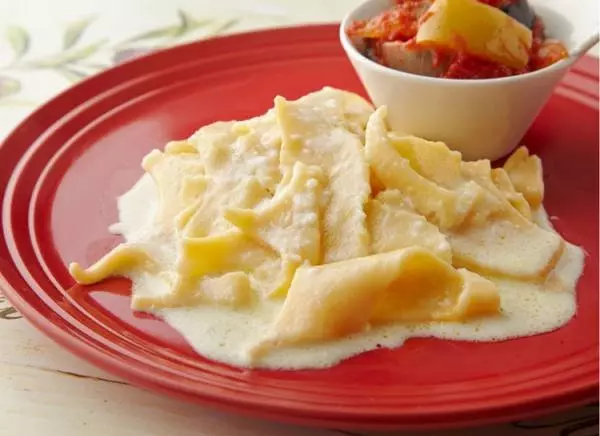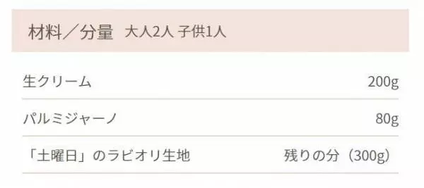 ① フライパンに生クリームとチーズを入れて火にかけて混ぜながら温める② ラビオリ生地を1辺3cmくらいの三角形に切り、茹でる ※『マルタリアーティ』=三角形やひし形など不揃いに切った平たいパスタ