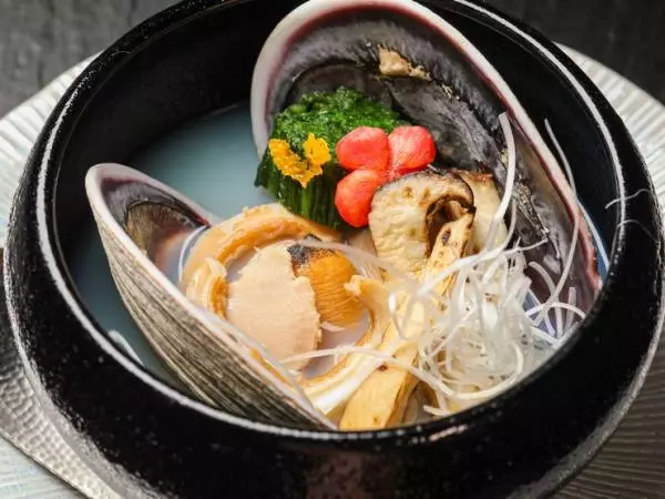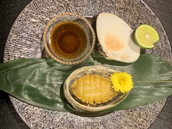 そんな貝の姿に期待感を高めつつ、まずいただいたのは『あわびの三分間蒸し』。サッと蒸し上げたアワビはやわらかく、上品な甘味がたまらないおいしさ。添えられた岩塩と、ポン酢とハマグリのだしを合わせたタレは、甘味を引き立てる名脇役です。