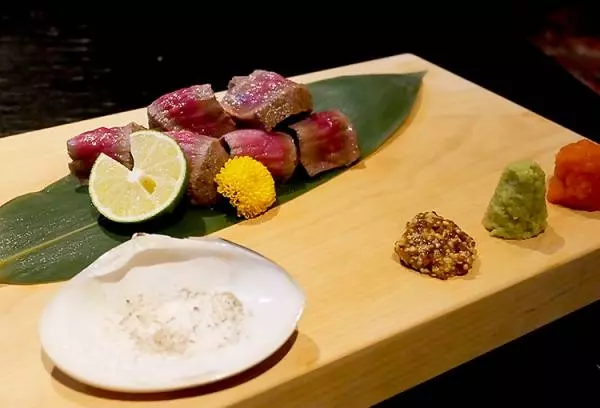 貝の次はお肉の一番人気へ。鮮やかな赤に目を奪われる、『黒毛和牛 うちひら 炙りステーキ』は、やわらかくジューシーながら、赤身のしっかりとした肉感もたまらない至福のひと品。粒マスタードやワサビを効かせるもよし、塩コショウでシンプルに…もよしと、味変しながらじっくり堪能するのがおすすめです。