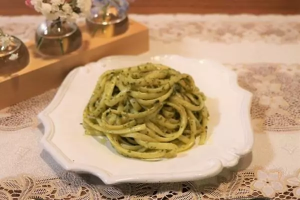 『ジェノベーゼ×リングイネ』は、バジルの新鮮な風味とオリーブオイルの甘さがほどよい一品