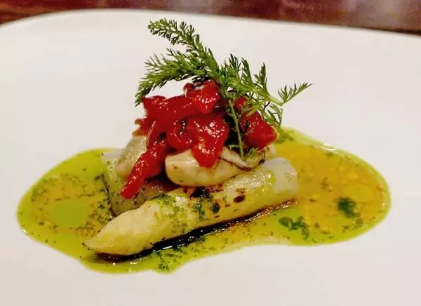 バスク地方でよく使われるパプリカを焼いてから、ガーリックオイルやビネガー、カキの出汁でエスカベッシュ(マリネ)に。特有のほどよい酸味が、パプリカの甘さやカキのコクと融合して、奥行きのある美味しさを堪能できます。続いてホワイトアスパラガスを食べるとシャキシャキとした食感が加わり、さわやかな余韻が口いっぱい残ります。