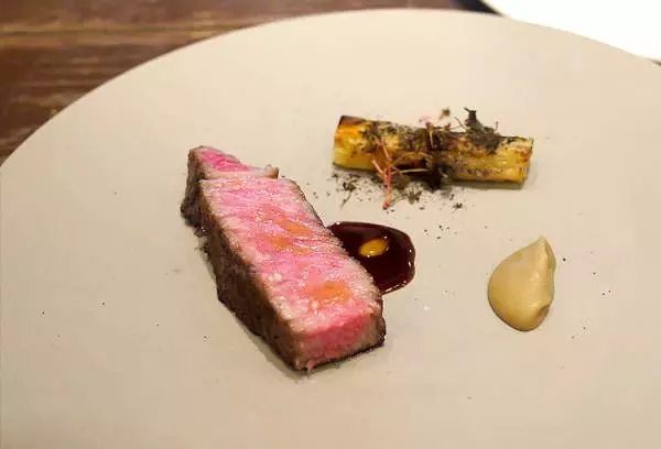 2皿目は、コース料理のメインの一皿『飛騨牛リブロースの炭火焼』。