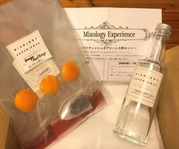 公式HPからデリバリーができるカクテルを注文。今回は、世界各国で人気の「ネグローニ」をアレンジした『ブリティッシュネグローニ』を頼んでみました。数日後には、使用するお酒とトッピング、つくり方のチラシが同封された箱が到着。初めてのカクテル作りにドキドキしながらも、さっそく作ってみました!