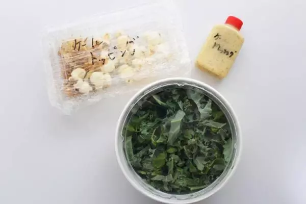 青々としたケールにはポップコーンなどのトッピングとドレッシングが付いてきます