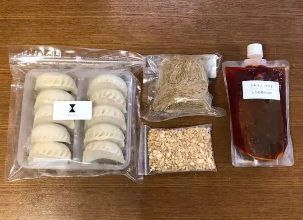 『餃子10個とよだれ鶏のたれと山椒麺のセット』5,400円(税込)。それに胡麻とナッツもセットで、冷凍で届きます