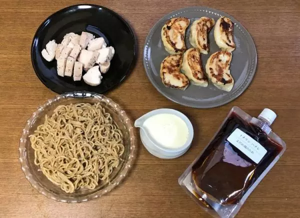 蒸し鶏、焼き餃子、茹でた山椒麺、それにアレンジで豆乳スープを用意しました