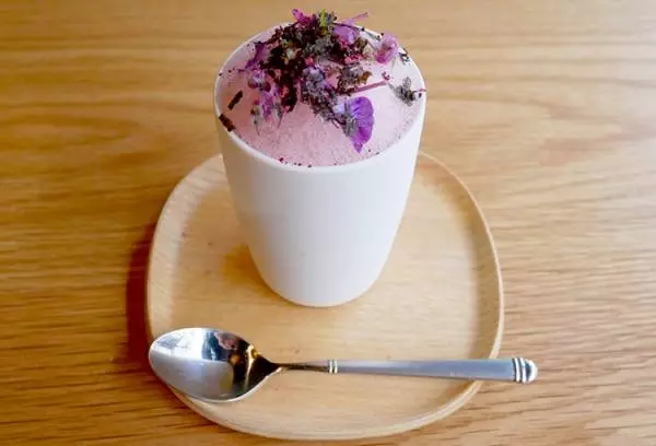 『イチゴとホワイトチョコレートのプリン 赤紫蘇風味の泡を添えて』