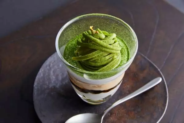 「お待たせしました」という声とともに登場したのは、周りの緑に溶け込むような可愛い緑色のパフェ。上品な甘さに炊かれた丹波黒豆に、山政小山園の抹茶をふんだんに使った葛やクリーム、ラング・ド・シャなどをバランスよく組み立てている。これぞ京都ならではのパフェだ。お腹いっぱいでもペロリと入る絶妙な量も嬉しい。