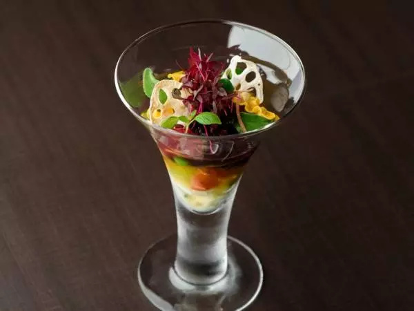 コースに登場する『海土パフェ』。北陸の海の幸や加賀野菜などを重ねた逸品は味もさることながら、見た目も芸術の域