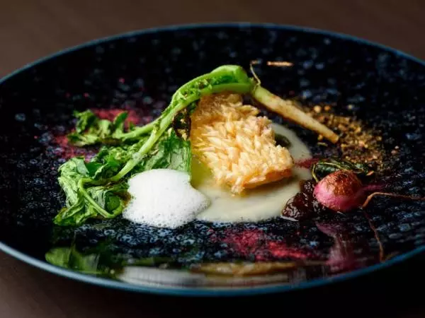 輪島産の甘鯛を使った鱗焼き。近江産チーズと旬野菜のソース、珠洲産の塩のエスプーマで洋のエッセンスをプラス