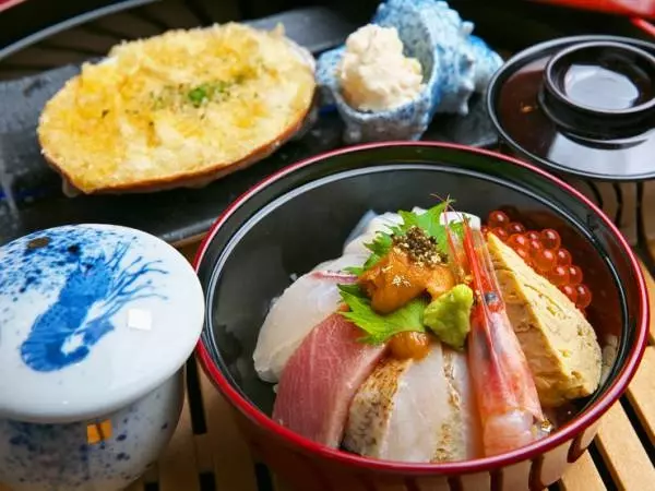 海鮮丼、鮑コロッケ、茶わん蒸しと、日本海近海の魚介を贅沢に堪能できる『伝助丼DX』2,600円(税抜)