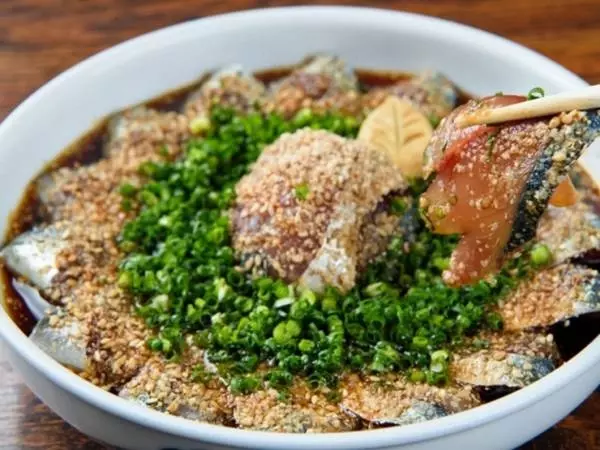 鮮度が抜群な生さばの上に、擦ったばかりのゴマをたっぷりとかけ、ネギを散らした『ごまさば』(2人前)2,480円(税抜)は必食