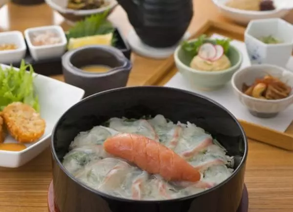 お客の8割以上がオーダーする博多めん鯛まぶしセット(1名様)4,000円(税抜)は、ご飯もの以外に明太コロッケや甘味もセットでお得