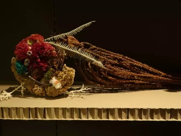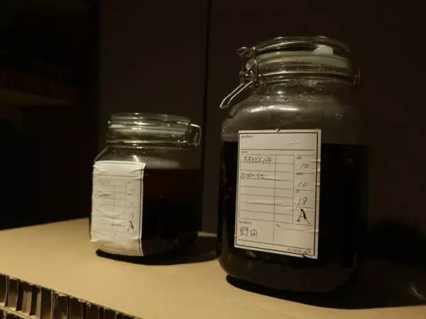 店内の棚には料理に使用する発酵・熟成中のハチや木の実などが飾られている