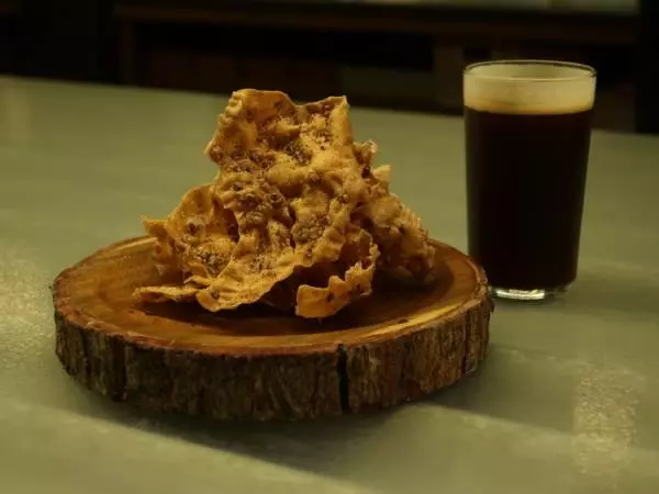 それでは、早速気になるディナーコースの一例をご紹介します。はじめにでてきたのは、コオロギスナックとコオロギビールのペアリング。今までコオロギを食べることを考えたことが無かった私は、どんな味がするのか全く想像もつかず、ドキドキしながらコオロギスナックを一口。