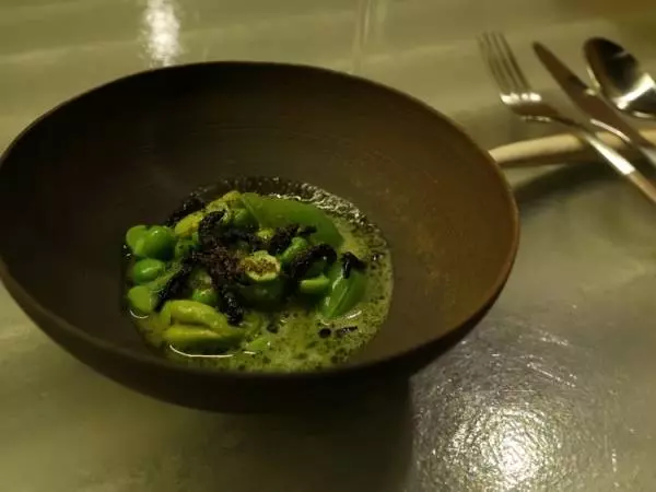 甘じょっぱく煮たざざ虫と旬の野菜を使った一品。ミントの香りがさわやかに鼻を抜けます