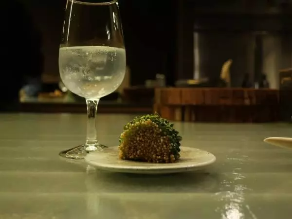 鮎のコンフィとゴーヤに、揚げたキヌアを纏わせた一品。ゴーヤの部分を持って一口で含むと「サクッ、プチッ、カリッ、ふわ」っと、いろいろな食感が弾けます。ゴーヤの苦味が残った状態でタガメジンを飲むと、ラフランスのようなフルーティーなタガメの香りが広がり驚愕。