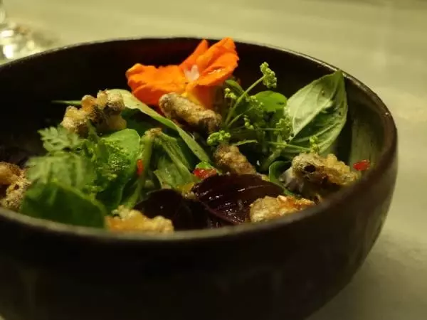 次に出てきたのは『お蚕さん』という蚕のさなぎをメインにハーブなどを使用した、お花畑の中にいるような盛り付けがかわいらしいサラダ。蚕の濃厚な甘みと、ハーブの香りが口の中で絶妙にマッチします。蚕を実際に育てているというスタッフの豊永裕美さんが実際に成虫になった蚕をみせながら、その生態や味などを教えてくれます。食材とリアルに触れ合いながら食べられるものこの店ならではの体験。