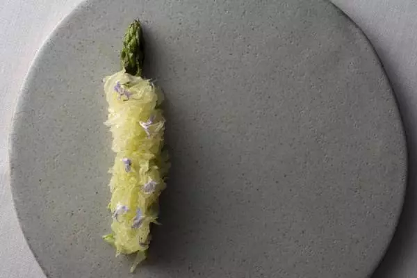 『グリーンアスパラガスアーモンドソースと文旦』アスパラガスのもともとの甘味を感じさせる仕上がりに。