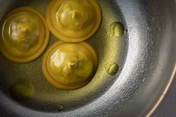 『しろいし蓮根のラビオリ』ラビオリの生地にはタピオカ粉を練り込んでもっちりした食感を出した。