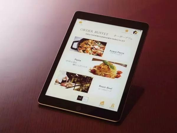 バイキングのニューノーマルとして新しく導入された筆頭がタブレットだ。ゲストは好きなものを好きなだけ、タブレットでオーダーすることで密を回避。また、タブレットで注文して席で友人と話をしている間に、ホテルスタッフができたてをサーブしてくれるから、ブフェ台で待つ時間もない。安全安心を確保するためにも、ゲスト自らが取りに行くのでなく、好きなものをスタッフが運ぶという形に発想を転換。席を立つことなく自分のためだけに作られたできたての料理をいただける贅沢な体験ができる。もちろん、店内のブフェ台は健在。ブフェ台で用意されているケースに入った色とりどりの料理を見ながら、その場で注文する楽しさも無くなってはいない。