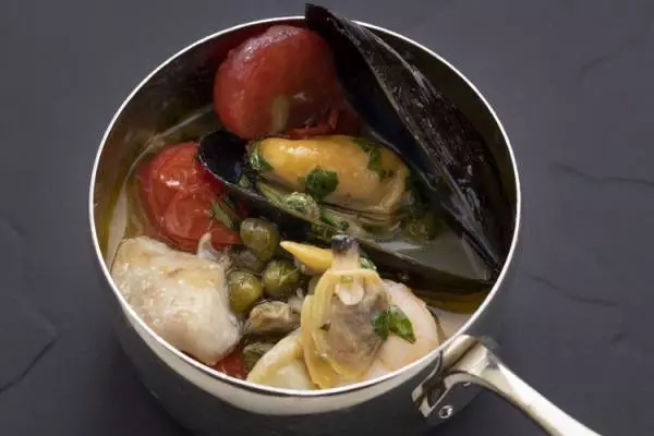 一人分ずつ取り分けられた『アクアパッツァ』。魚介の旨味がしっかりと溶け込んだスープも一滴残らず飲み干したい
