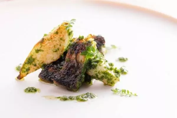鰻の白焼きをマコモ茸と共に木の芽仕立てジェノゥェーゼであえた一皿