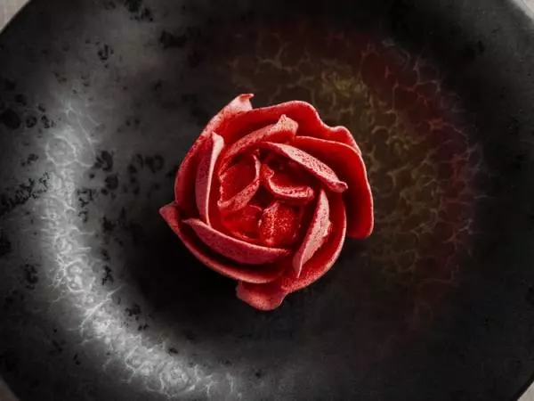 小林圭氏のスペシャリテとして人気のメレンゲのデザート「ヴァシュラン」を、ペストリーシェフの小堀真弓さんがフランボワーズのメレンゲで1枚1枚花びらをつくり、大輪のバラの花で表現。フランボワーズのソルベ、ココナッツムースの組み合わせで、ゴージャスですが味わいは繊細で軽やかです。