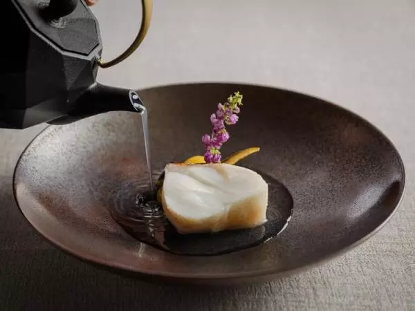 仕上げに蛤と昆布のだしをかけていただく日本的な感性が光る一皿、『クエ 蛤のだしで』