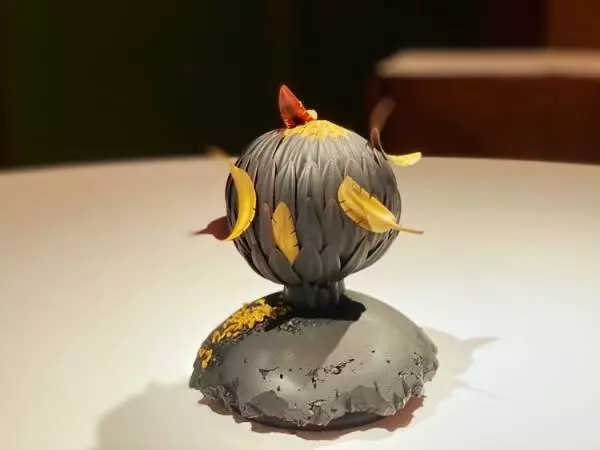 「今は、コロナの影響もあり装花は控えております。かわりに、こちらに料理長手作りのオブジェを飾らせていただきました」。サービスの方から説明を受けて、グレーのアーティチョークに金色の羽がふわりととまっている素敵なセンターピースに目をやる。