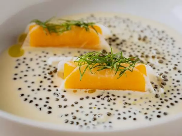 『カボチャ キャビア』。カボチャのピューレは、栗のようなホクホクした甘みが特徴の“恋するマロンカボチャ”と濃厚な旨みの“ブラックジョーカボチャ”の2種類をブレンドしている