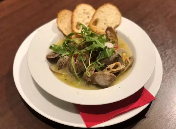 続いては、秋が旬の『北海道厚岸産 浅利の深川ワイン蒸し』。ふんだんに入っている浅利は、身が大ぶりでぷりぷり。味付けはガーリックバター風味で、添えてあるパンを浸して食べるのはもちろん、スープのみでいただくのもオススメです。お店の醸造所でつくられた白ワインで蒸しているため、同じ種類のワインを一緒にいただくのもツウな楽しみ方です。
