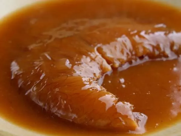 『毛鹿鮫フカヒレの姿煮込み』(250g 13,800円)。厚みのある毛鹿鮫ならではのざくりとした食感と白湯の旨味が後を引く逸品。3〜4人で楽しめる。ハーフサイズもあり。