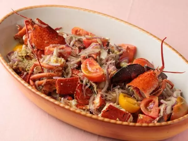 活ロブスターにレッドオニオンとトマトをオイルで絡めた『ロブスターのカタラーナ風』(2日前までに要予約)4,500円/尾