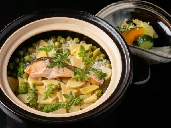 京野菜や福知山の和牛など地元食材をはじめ、自然の恵みをたっぷりと蓄えた丹波篠山の食材や有機野菜を使用した京料理が味わえます。こだわりの農家直仕入れの丹波篠山産こしひかりを使った『食事』はコースの〆。季節ごとの食材でいただけます。また、シャンパンをはじめとした「ケンゾーエステイトワイナリー」のワインがフルラインナップ。
